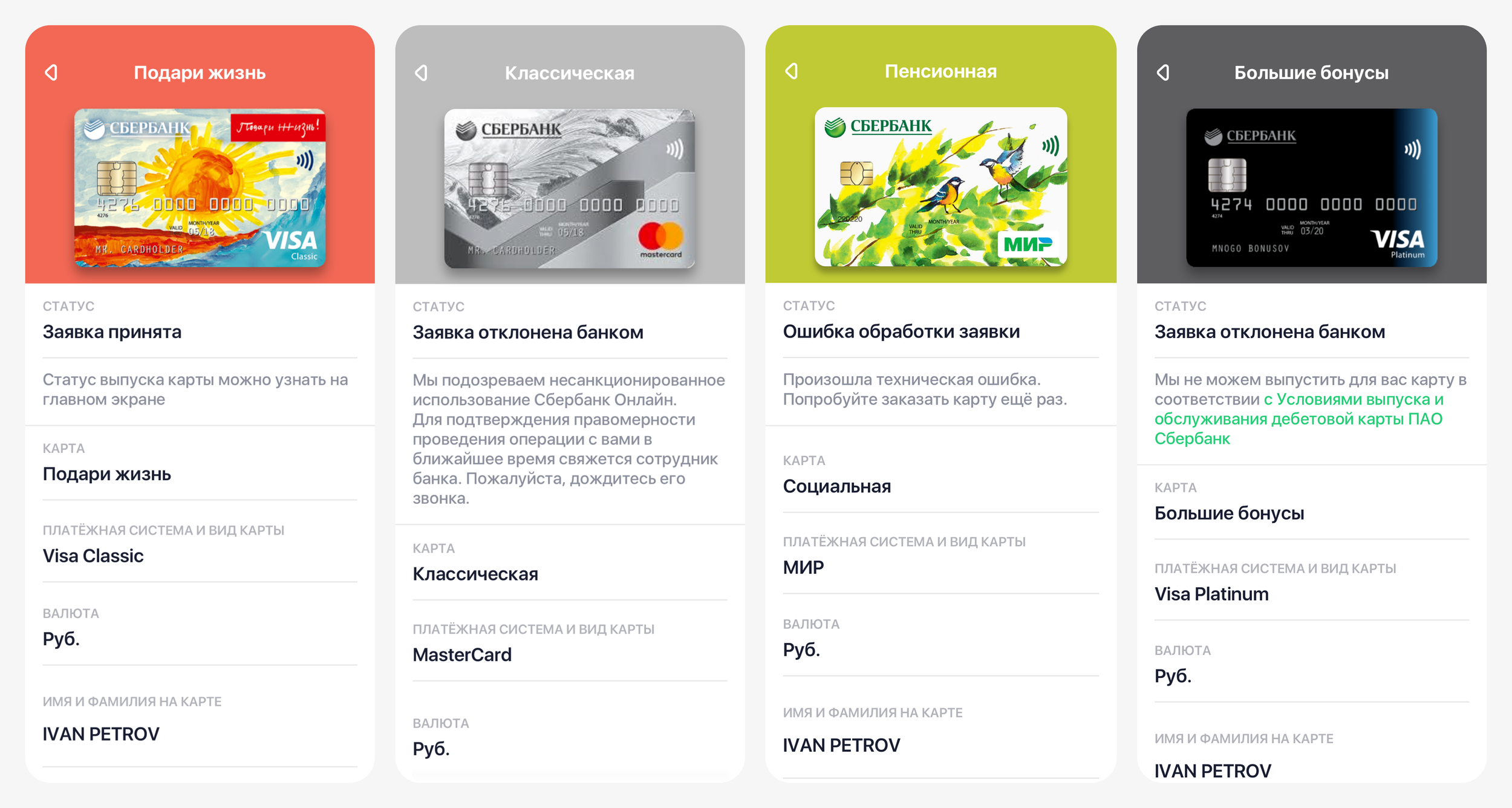 It was an ambitious project launched in 2017. At that time, no bank app worldwide allowed users to order cards online. A team of seven people changed the game — I was the designer on that team. After the successful launch, I received an award from the Chairman of Sber and was promoted to Lead Designer of the Card Solutions Department. The product saved the company millions of dollars and attracted a new audience to the app